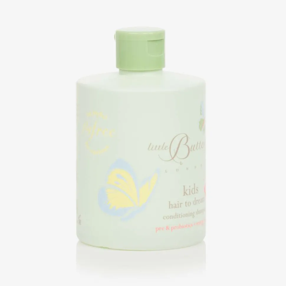 'Hair to Dream' conditioning shampoo for boys and girls from Little Butterfly London, made in the UK. Fortified with a balanced blend of Omega 3, 6 and 9 oils, and plant-based pre- and probiotic ECOSKIN, this natural fruity-fresh and vegan formula leaves hair shiny, strong, and touchably soft.