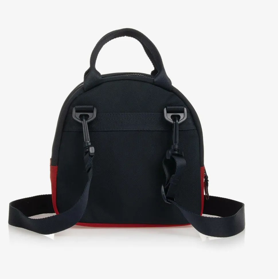 Navy blue and red lunch bag for boys and girls by Tommy Hilfiger, made from recycled canvas fabric with signature striped details. Great for lunches on the go and to keep school lunches fresher for longer, this colourblock bag has one main compartment with an insulated interior. There is an elasticated bottle holder inside and a handy zip pocket on the front for extra snacks. It has two top handles and a detachable shoulder strap for a hands-free option.
