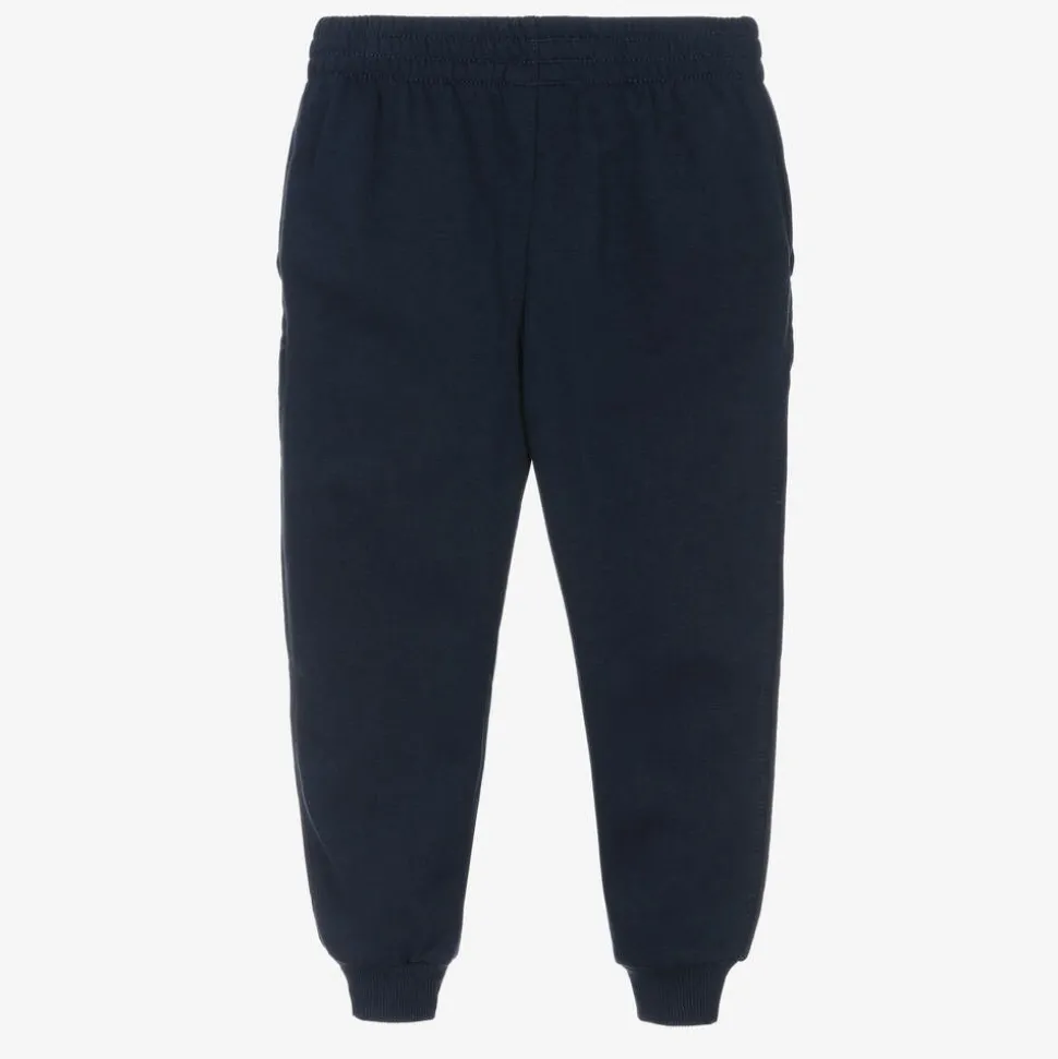 Casual navy blue joggers for boys and girls by American brand Nike, made in soft, cotton blend jersey. Warm and fleecy on the inside, they have an elasticated waistband for a comfortable fit and slanted front pockets. A shimmery silver logo appliqué adds instant designer appeal.