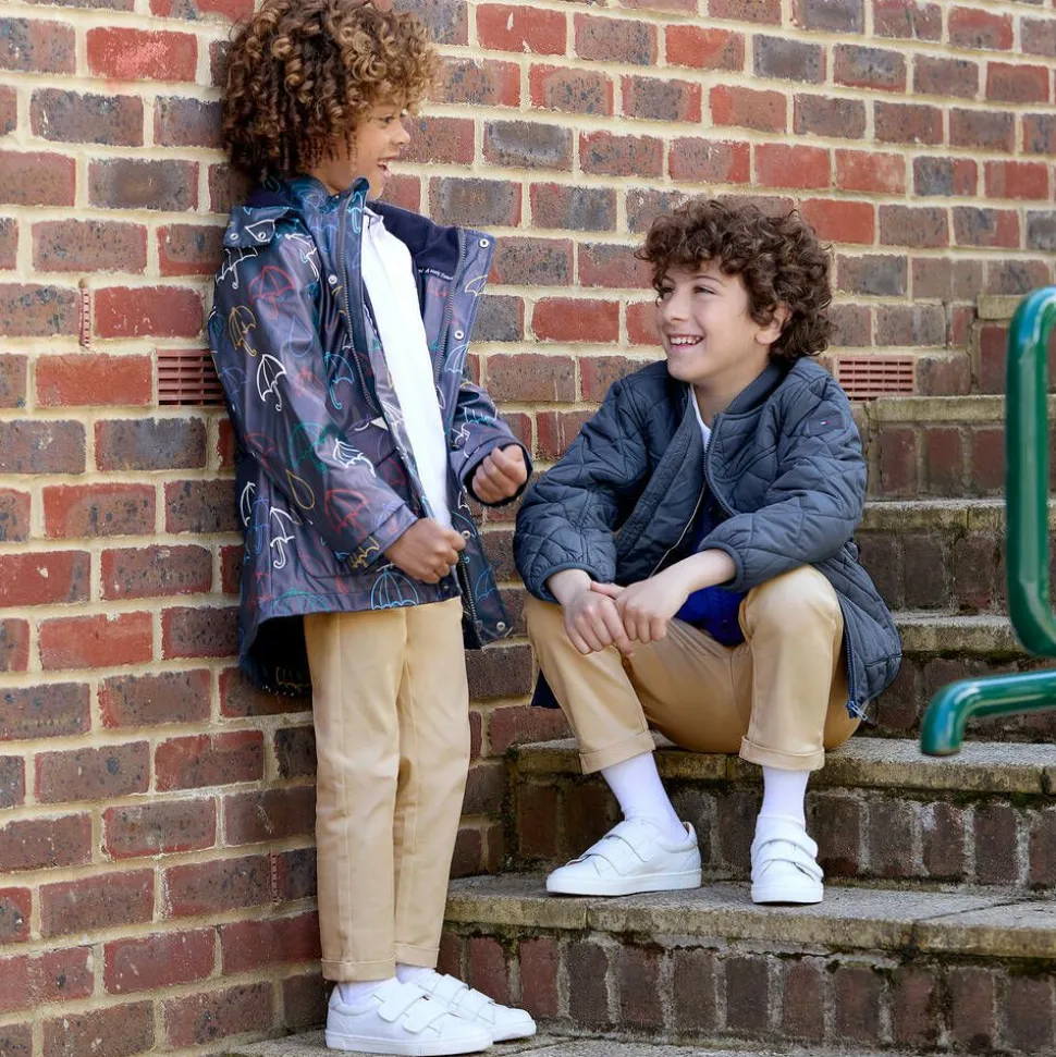 Soft and silky, this navy blue quilted jacket for boys and girls is by American brand Tommy Hilfiger. Ideal for cooler days, it has lightweight padding and a detachable, lined jersey hood in grey marl, secured with buttons. The collar is ribbed, whilst the cuffs and hemline are elasticated for a cosy fit. On the front is the designer's signature embroidered flag logo, as well as two useful patch pockets. It fastens with a front zip and is fully lined in satin for comfort.