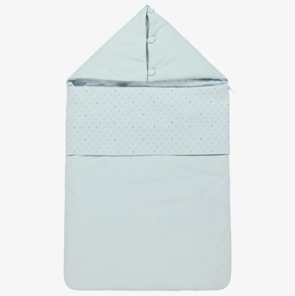Light blue nest for baby boys by Emporio Armani, made in soft cotton jersey. The front panel is made in soft cotton poplin, with a tonal blue and navy blue Eagle logo pattern to match the inside of the hood. The nest is lightly padded and has a smooth zip fastening along the side and bottom. The hood can be unbuttoned and laid flat like a pillow, ideal as a comfortable surface for baby to lay on as they grow.
