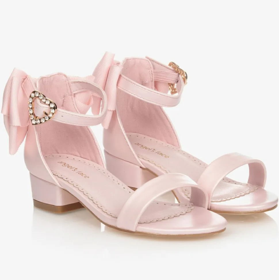 Girls special occasion sandals by Angel's Face, in pearlised pale pink faux leather with 3.5 cm-high heels. Fastening with sparkly diamanté, heart-shaped buckle on the ankle strap, they have pretty grosgrain bows on the back.
