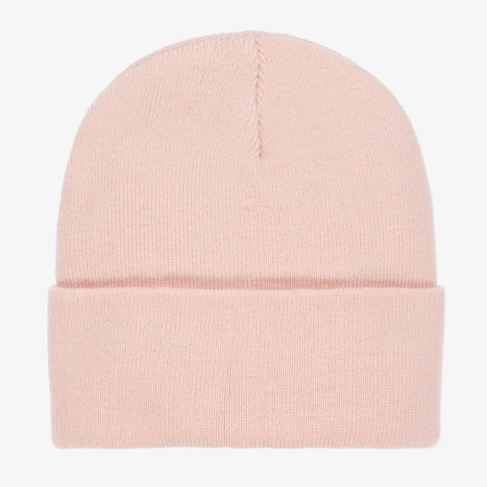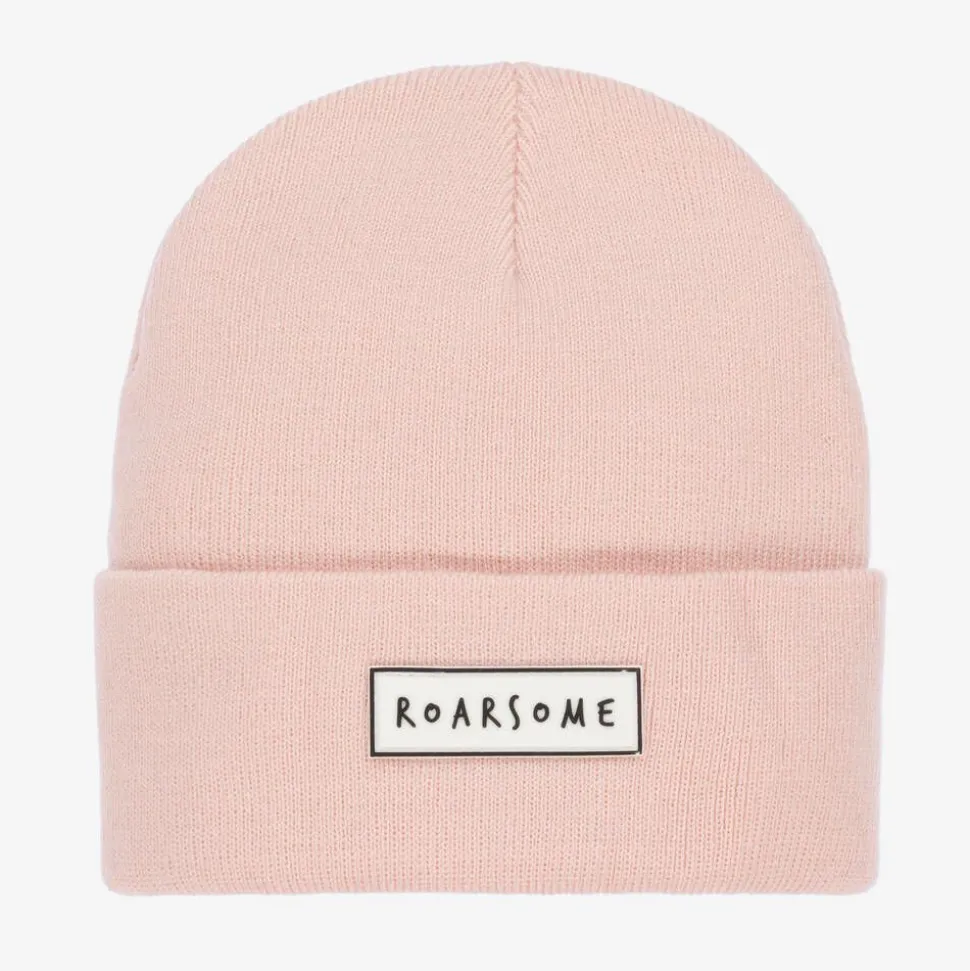 Pale pink beanie hat for girls by Roarsome, knitted in a cosy double layer from soft recycled yarn. Great for the outdoors, this lovely accessory has a turned-up brim with a rubberised logo patch on the front.