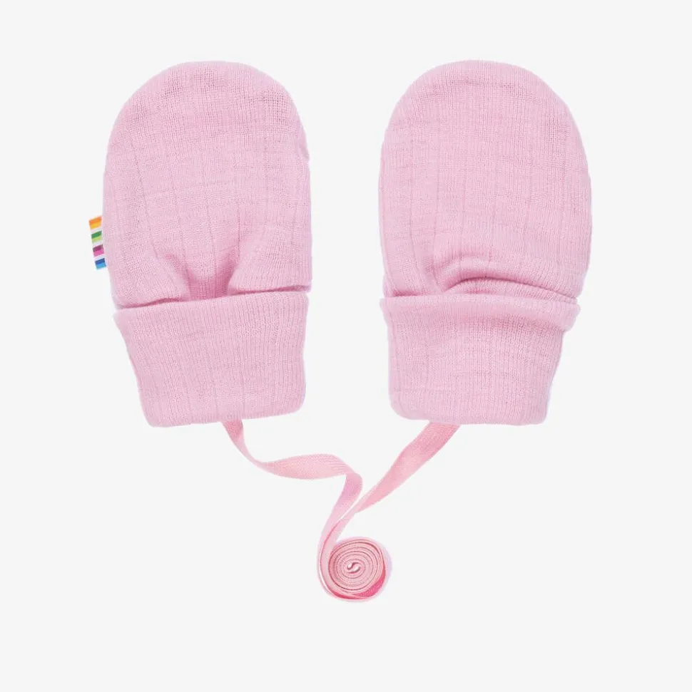 Pink mittens for baby girls by Joha, knitted from fine Merino wool jersey. Soft, stretchy, and ribbed, they have a striped logo tab on the side seam.