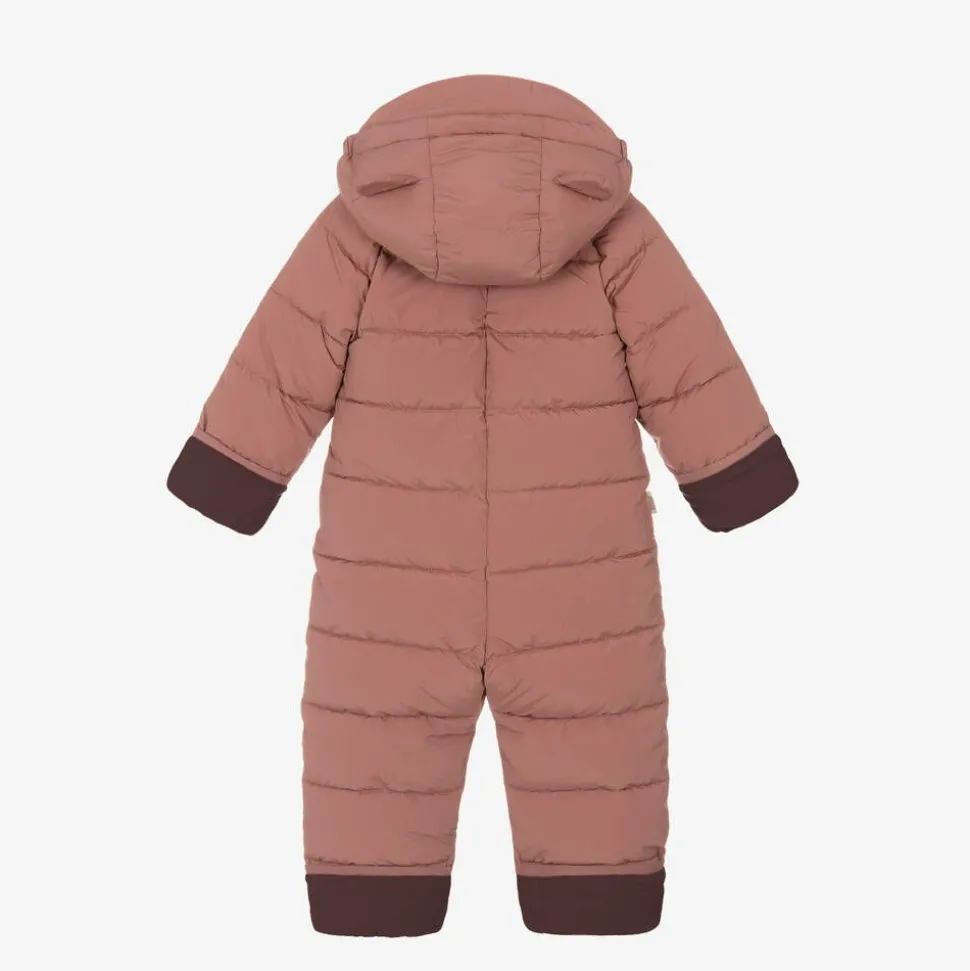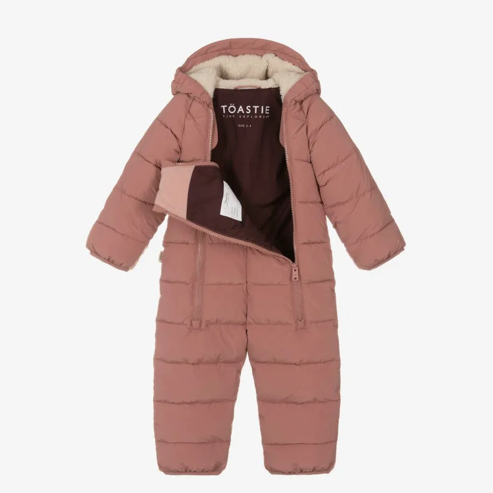 Dusky pink snowsuit for little boys and girls by British brand Töastie, with a brown logo patch on the front. Silky smooth with a contrasting burgundy lining, this warmly padded, water-repellent suit has a double zip fastening on the front for easy access. The fixed hood has cute 3D ears and is lined in thick sherpa fleece for extra warmth. Also protecting little hands and feet, there are attached fold-over cuffs, lined in cosy polar fleece.