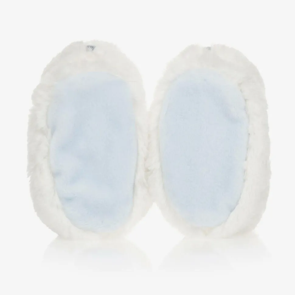 These gorgeous white slippers are made by Doudou et Compagnie for baby boys and girls. They have a gentle rattle sound, which will help keep baby amused as they move their little feet. They are made from super soft plush fur with a rabbit face and pale blue velour trims.