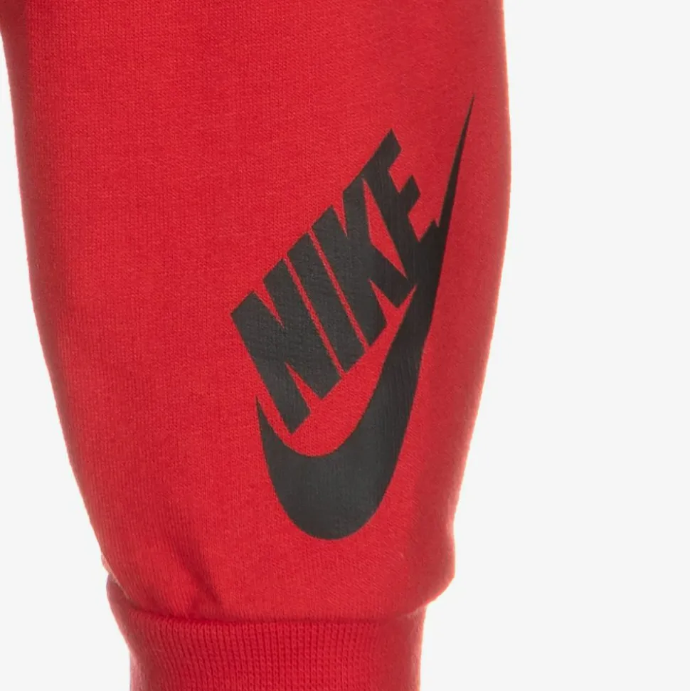 Black and red tracksuit set for little boys by Nike, made in comfortable cotton sweatshirt jersey. The black hoodie has a red Swoosh logo and a front zip fastening. The red joggers have an elasticated waistband and a black logo print. The grey marl bodyvest has an all-over logo print and popper fastening between the legs.