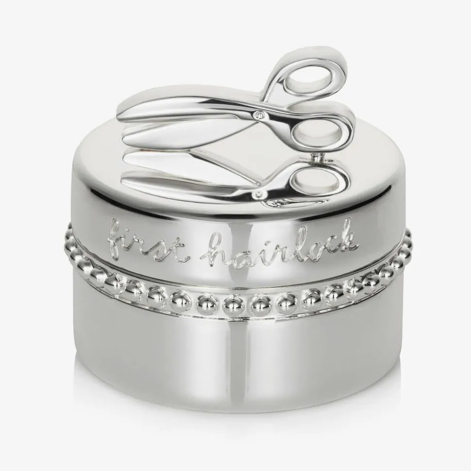 A silver plated hairlock keepsake box by Bam Bam. Decorated with a dainty pair of scissors on top and scripted with 'first hairlock' on the side, this beautiful item will help you treasure those precious first memories of baby. It is presented in a lovely branded box.