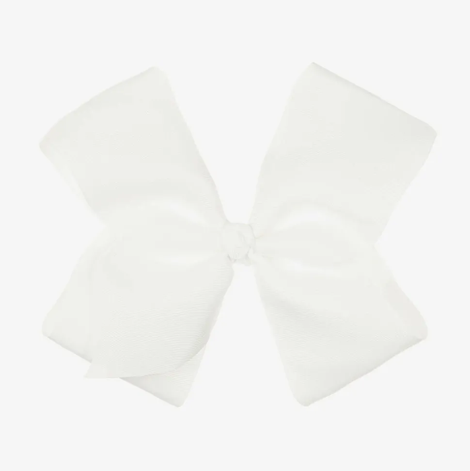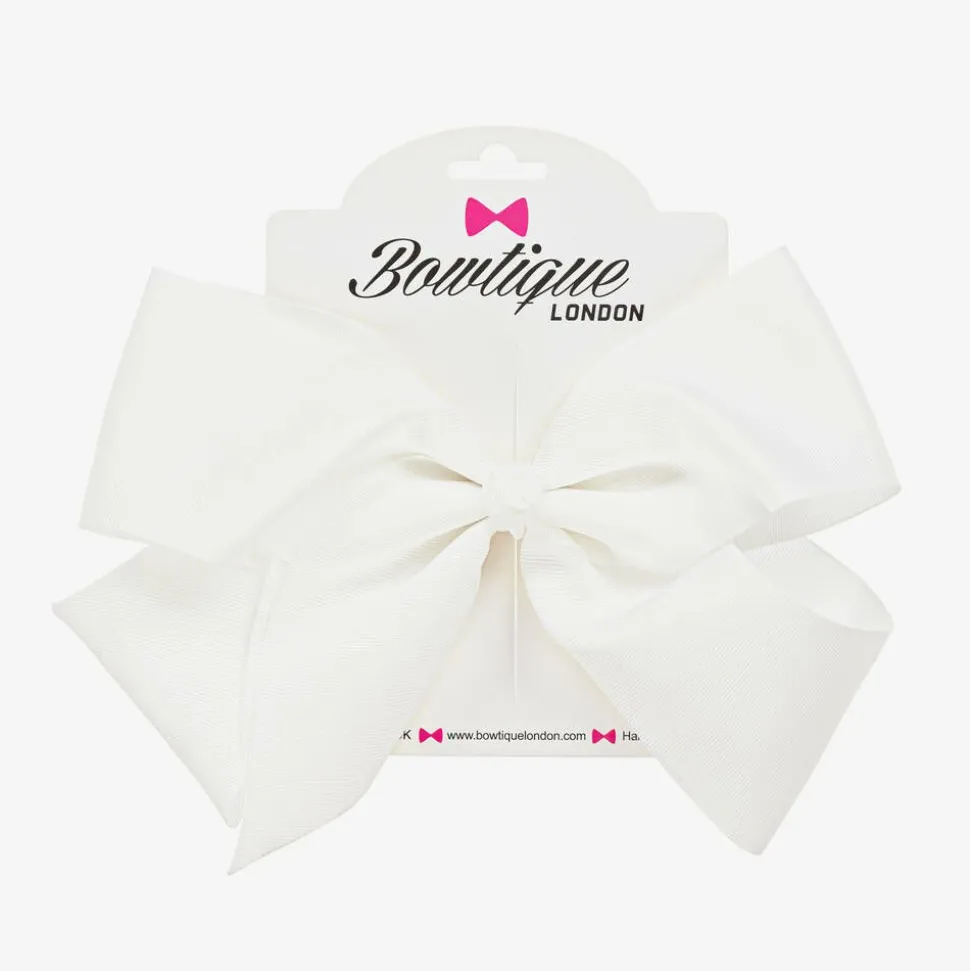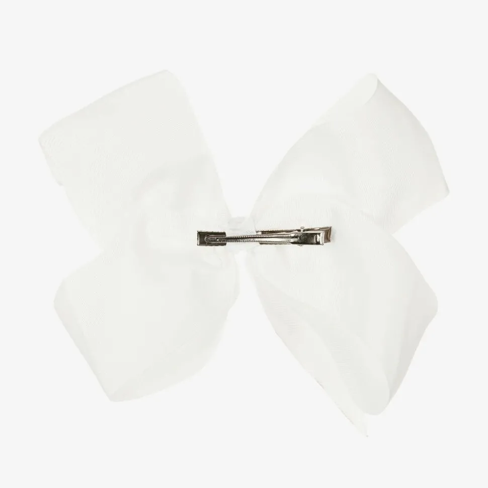 An extra large white bow hair clip for girls by Bowtique London. Stunning and eye-catching, it is handmade in grosgrain ribbon with a slide-in metal clip.