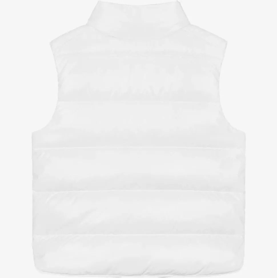 Silky smooth with a shiny finish, this white puffer gilet for little boys and girls is by luxury brand Moncler Enfant. Water repellent and breathable, it is padded with lightweight down for superior comfort and warmth. It has a popper-fastening storm flap over the front zip to help keep out chilly winds, with useful zipped front pockets. The designer's iconic felt logo badge is sewn on the chest for a signature finish.