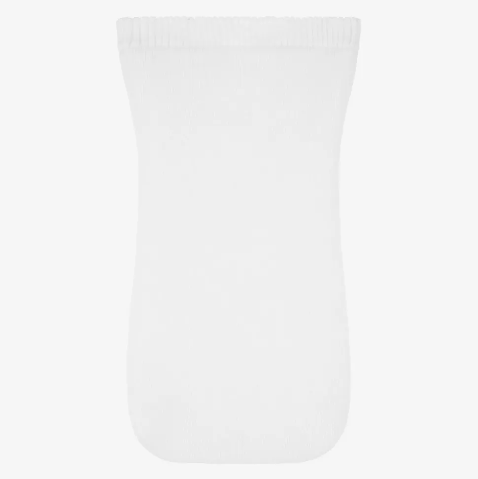 Baby girls and boys white baby nest by Minutus, warmly padded and knitted in soft acrylic. It has a zip fastening on the front and is ideal for use in the pram or car.