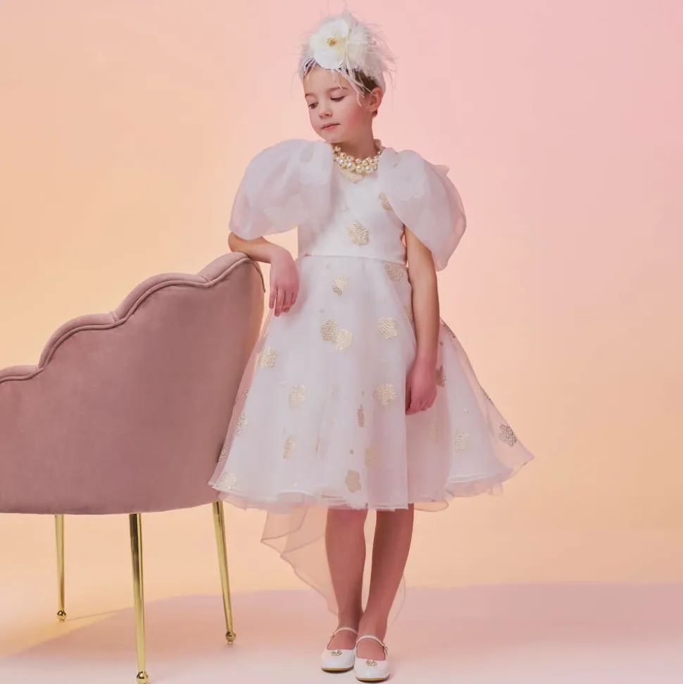 Off-white patent leather ballerina pumps for girls by Manuela de Juan. Perfect for parties and special occasions, these lovely shoes have a buckle fastening strap and are decorated across the toes with a sparkly jewel. They are fully lined in soft leather and have a small heel and non-slip rubber sole.