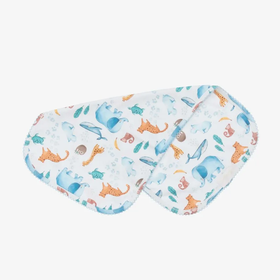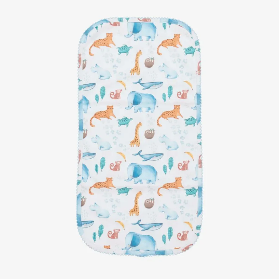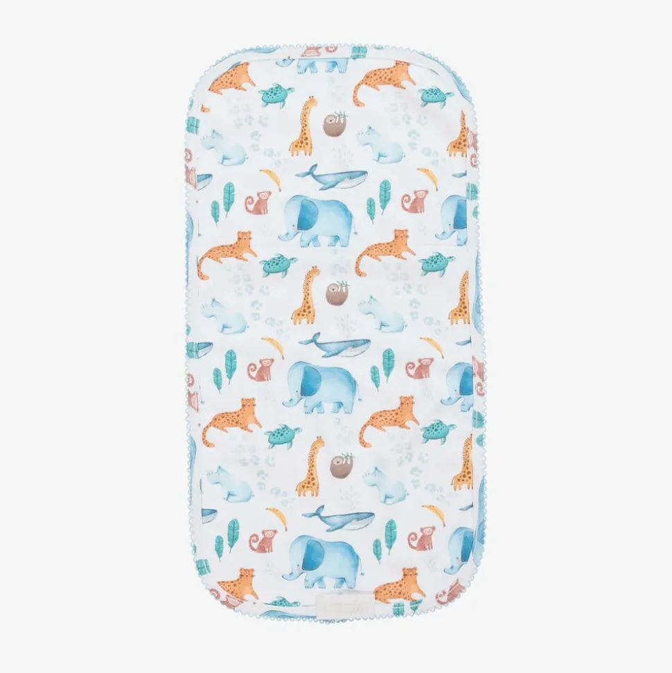 White burp cloth for baby boys and girls by My Little Pie, made in super soft organic Supima cotton jersey. Both sides are patterned with cute blue and orange jungle animals and sea life creatures. Edged with delicate blue picot embroidery, this useful feeding accessory can be placed over the shoulder when burping your baby and used for wiping those little spills after a feed.